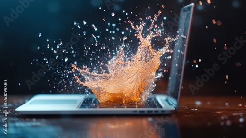 A striking image shows water splashing onto a laptop, capturing the essence of unexpected moments and the fragility of technology in an artistically dramatic manner.