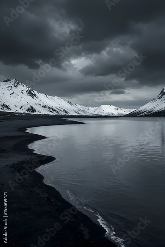 paesaggio nordico con veduta di spiaggia dalla sabbia nera monti innevati e acque. cupe
