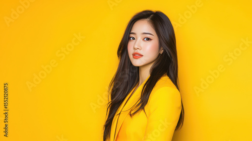 Stylish Asian woman poses confidently against vibrant yellow background, showcasing her long hair and fashionable outfit