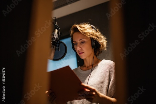 Woman prepares herself and a material before voice recording. Soundproof room for professional recording vocal. Voice artist works with material before dubbing or voice over process