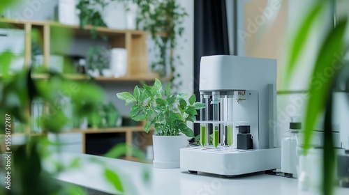 Chromatograph in an Earth Day lab analyzing eco friendly plant based substances with greenery recyclable materials and eco conscious decor reflecting the theme of environmental sustainability