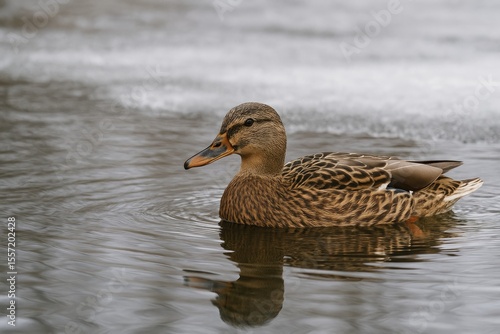 Wild female mallard duck gracefully gliding across a pond