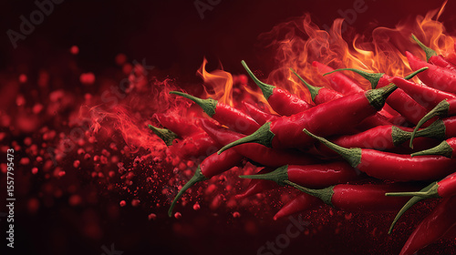 Ognisty pęd: grupa czerwonych papryczek chili z ognistymi płomieniami i latającymi drobinkami na tle głębokiej czerwieni. Symbol intensywnego smaku.