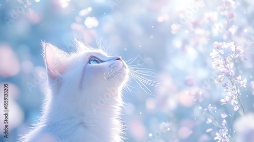 A beautiful anime cat with pale, flowing fur, and big blue eyes.