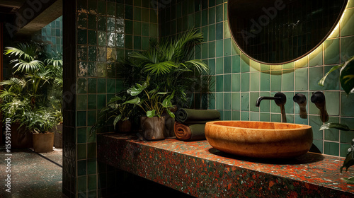 Egzotyczna łazienka z zielonymi płytkami i drewnianą umywalką. Wnętrze pełne roślinności i lustro z podświetleniem tworzą tropikalny klimat. Idealne dla miłośników natury.