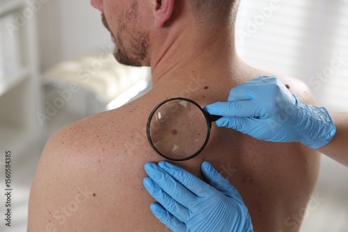 Doctor examining man's moles in hospital, closeup