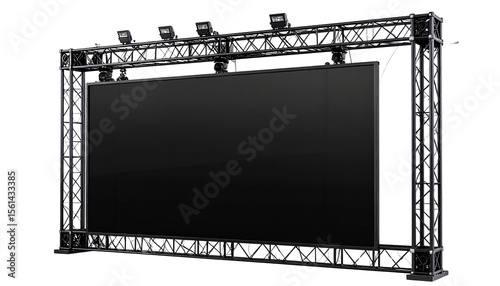 A large rectangular blank black LED screen with a transparent frame and dark grey metal truss structures, with even lighting on white bg in Png.