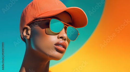 Stylish woman wearing sunglasses and orange cap against colorful modern background.