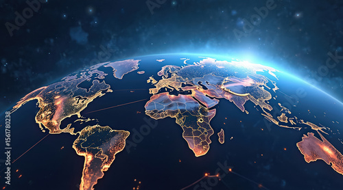 Global network connections around planet Earth at night. Aerial shot with glowing city lights. Digital world map cyberspace, logistic, transport routes. International business, worldwide trade,