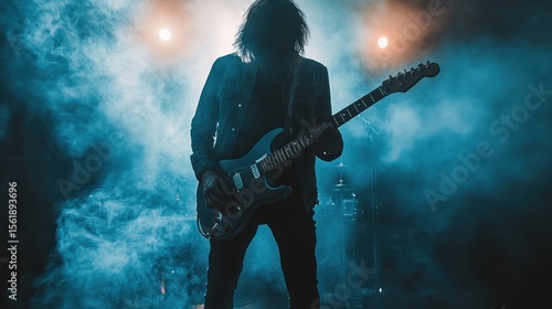 Lady Justice statue, dramatic blue smoke background. Stock photo