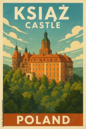This vintage poster artwork of Książ Castle in Poland features the stately hilltop fortress surrounded by thick forest beneath a striking blue sky with sweeping clouds