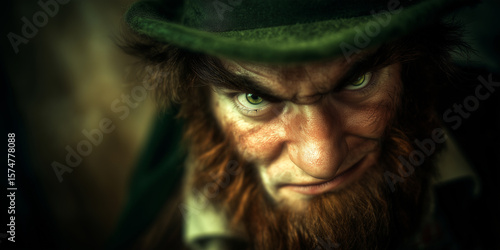 Złowrogi leprechaun z rudą brodą, intensywnie zielonymi oczami i szerokimi brwiami. Jego spojrzenie jest przenikliwe, kapelusz rzuca cień na twarz.