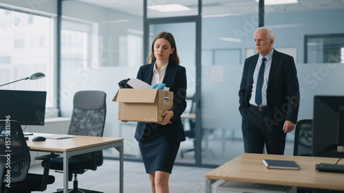 Woman leaving her job after termination, carrying a cardboard box, facing gender discrimination in the workplace