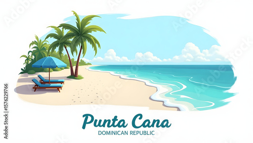 3d illustration of Punta Cana beach with turquoise sea and palms, and the words 'Dominican Republic' beneath. Idyllic tropical escape.