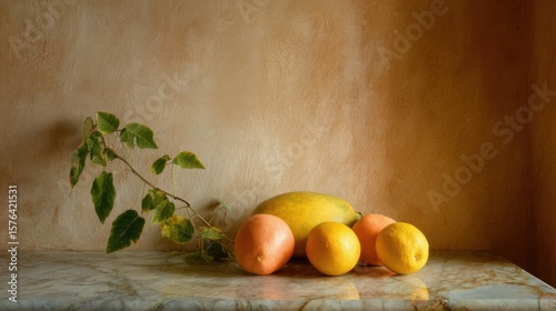 Vibrant Fresh Fruits including lemons, oranges, peaches, and a leafy branch on a marble surface with warm textured background.