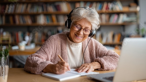 Elderly woman enjoying a virtual class, taking notes with a smile while wearing headphones at a cozy home office.