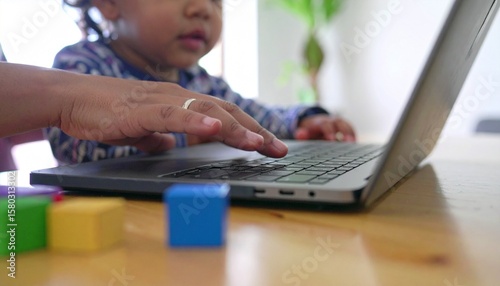 小さな子どもの手がノートパソコンのキーボードに触れている微笑ましい光景で、デジタル時代における子どもたちの学習環境と技術への早期接触を表現した現代的な教育シーンを捉えた写真で、未来世代の成長と発達における情報技術の重要な役割を象徴的に示したイメージ