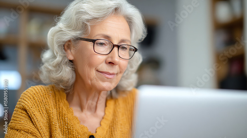 An elderly woman engages with her laptop, showcasing the joys of technology and learning in her later years.