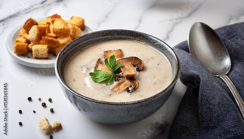 creamy mushroom soup with croutons and drizzle on a marble surface