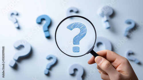 Hand holding magnifying glass over central question mark surrounded by smaller question marks on white background. Symbolizes critical thinking and problem-solving