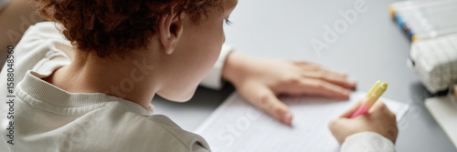Website header shot of Caucasian child writing with yellow pen on lined paper at desk, showing concentration and focus, curly hair visible, hands and upper body in frame, educational activity