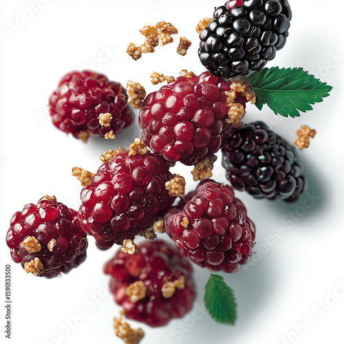 Czerwone i czarne jeżyny, z domieszką granoli i zielonymi listkami, latają swobodnie na białym tle, tworząc dynamiczną kompozycję.