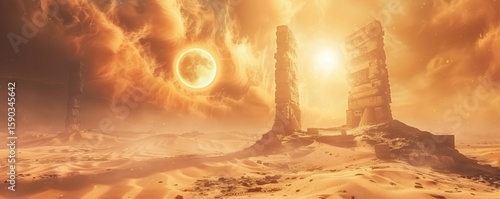 Two colossal ancient ruins rise from a vast desert, bathed in the orange glow of a solar eclipse. The celestial event casts dramatic light and shadows across the surreal landscape