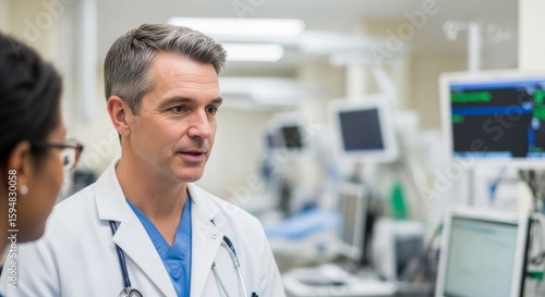Male doctor consulting with colleague in modern hospital intensive care unit