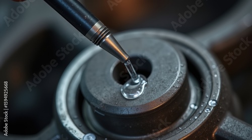 A square, top-view close-up of a spray nozzle applying a thin, even coat of lubricant onto a metallic bearing or gear