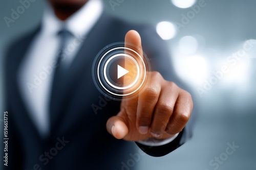 Biznesmen naciska cyfrowy przycisk play – koncepcja startu, technologii i decyzji w biznesie