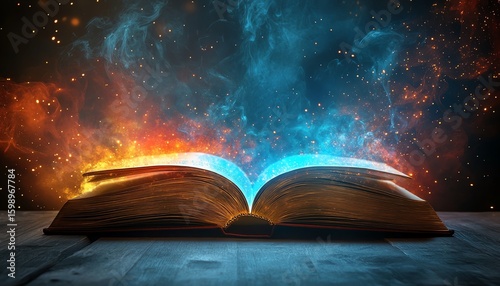 Magical open book with fire and ice emanating from its pages. Fantasy, mystery, knowledge concept.