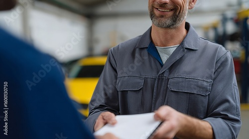 Smiling man in gray overalls hands paper, hint of camaraderie, garage camaraderie, Mechanical Transcendence Day, handshake symphony