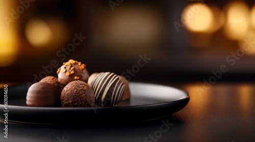 luxury chocolate truffle collection on a dark plate, moody lighting, gourmet presentation