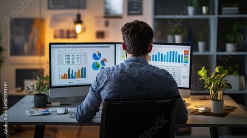 Person analyzing data on dual computer monitors.