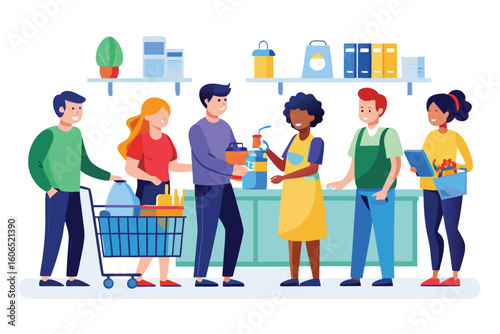 Customers lining up at supermarket checkout during busy shopping hours for groceries and household items