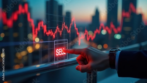 La mano de un comerciante pulsa el botón de venta en una interfaz táctil. Un gráfico financiero rojo se hunde en el fondo. Urgencia y precisión
