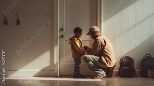 Faceless moment of parent preparing child for day at school or outdoor adventure