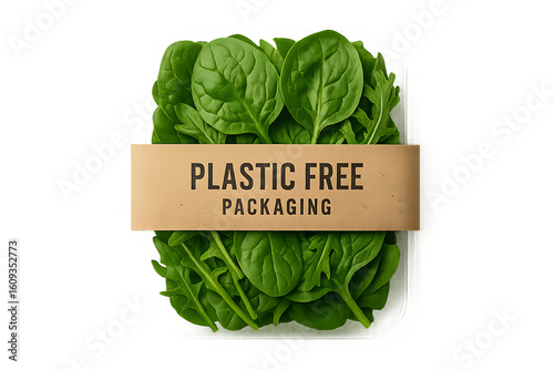 Eco-friendly packaging. Fresh spinach leaves wrapped in eco-friendly, plastic-free packaging promoting sustainable and environmentally conscious food packaging.