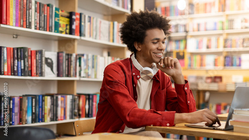 Positive African American student guy using laptop in college library, studying online or preparing for test, copy space. Technology-driven academic endeavors