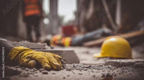 Construction site accident aftermath with yellow safety helmet and gloved arm lying in rubble, blurred reflective vest in background, highlighting workplace hazard, injury risk, and safety negligence