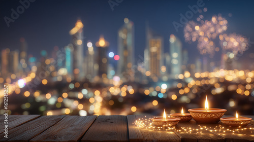 Diwali Diyas Glowing on Wooden Surface with City Skyline and Fireworks – Festival of Lights Celebrated with Urban Radiance