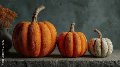 A side - view, ultra - realistic photography of three pumpkins of different sizes placed on a table in front of a grey wall