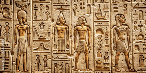 Intricate carvings showcase ancient Egyptian hieroglyphs representing deities and pharaohs in a well-preserved temple. The artwork reflects the rich history and culture of ancient civilization