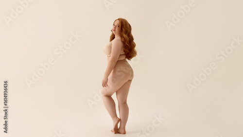 Confident plus-size woman posing in nude lingerie with neutral backdrop. Concept of expressive movement, celebration of joy and curves, energetic branding for underwear.