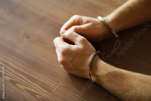 Close-Up of Hands in Handcuffs on Wooden Table - Arrest, Crime, Law Enforcement Concept