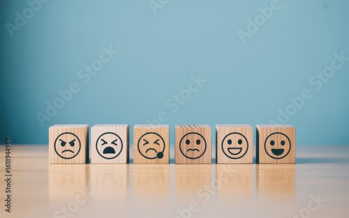 Faces of emotion wooden blocks display a spectrum of human feelings from anger to joy, reflecting user sentiment