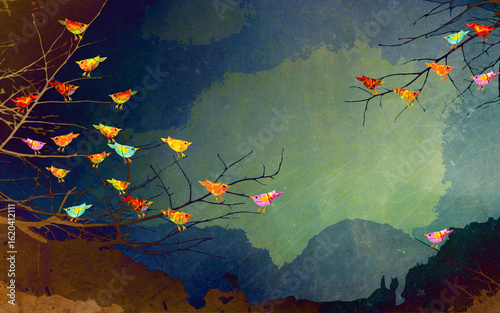Ilustracja grafika kolorowe ptaki na gałęziach drzew wieczorowa pora tekstura.
