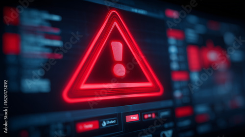 A vivid red warning triangle with exclamation flashes on a digital interface, signaling a critical cybersecurity alert that demands immediate response to mitigate systemic risk.