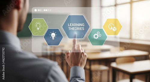 Man interacting with virtual learning theories interface in a classroom setting with desks visible