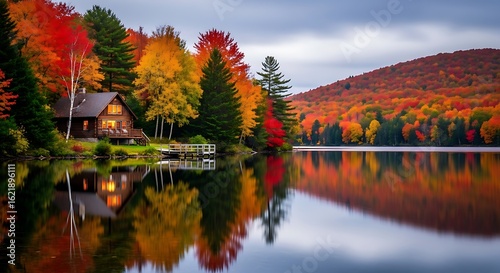A cozy log cabin nestled by a serene lake reflecting the vibrant colors of autumn foliage on surrounding trees and mountains
